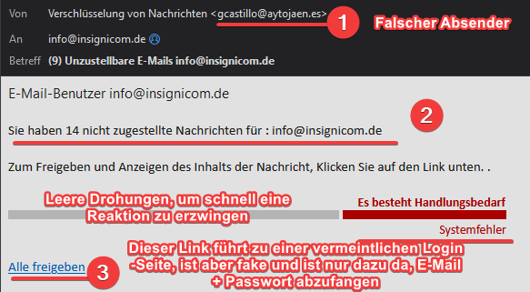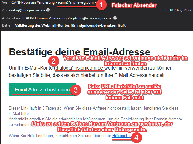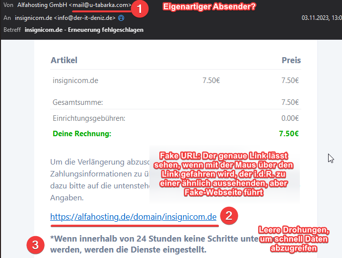 In letzter Zeit haben wir vermehrt festgestellt, dass gefährliche Phishing-Mails im Umlauf sind, die darauf abzielen, sensible Informationen unserer Kunden abzugreifen. Diese betrügerischen E-Mails geben sich oft als seriöse Unternehmen wie ICANN, unser Hoster Alfahosting oder sogar wir selbst, die Insignicom Werbung GmbH, aus. Die Täter hinter diesen Mails haben eine Reihe von Tricks entwickelt, um ihre Opfer zu täuschen und zur Preisgabe ihrer persönlichen Daten zu verleiten. Wir geben Ihnen heute einige Tipps, um solche Betrugsmaschen zu erkennen.